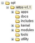 1.3 RETOS Installation You can install RETOS after finishing the previous section. You finish RETOS installation by downloading the RETOS kernel binary and application development tools and decompressing them into certain directory. /apps: Makerules for application sources and compilation